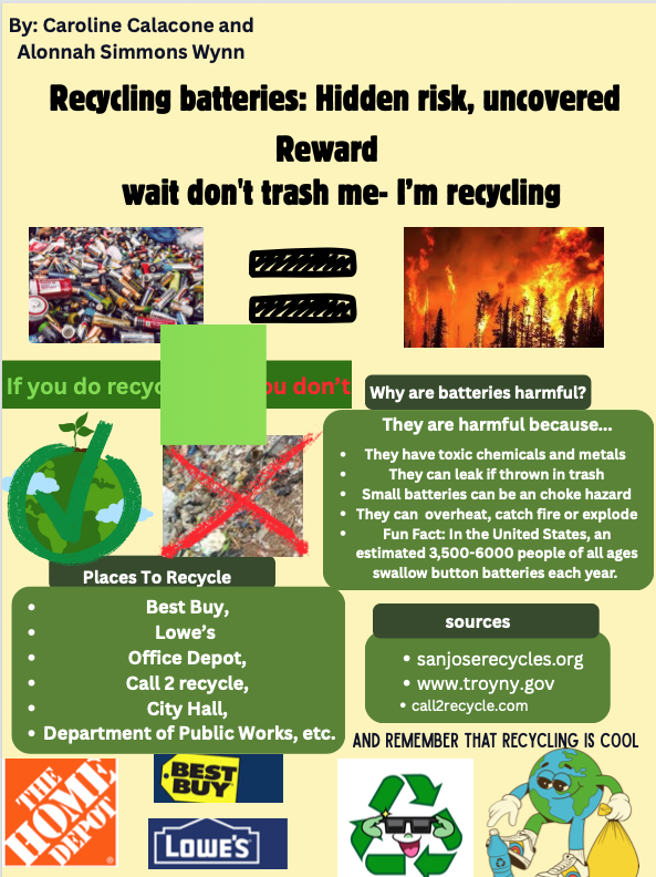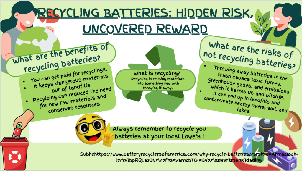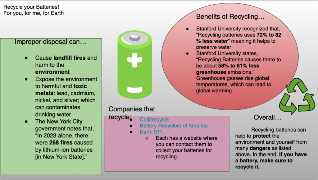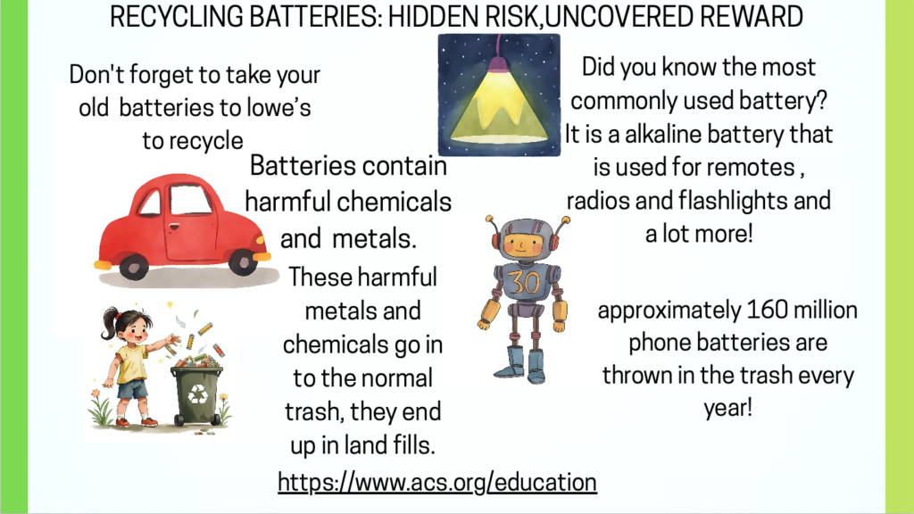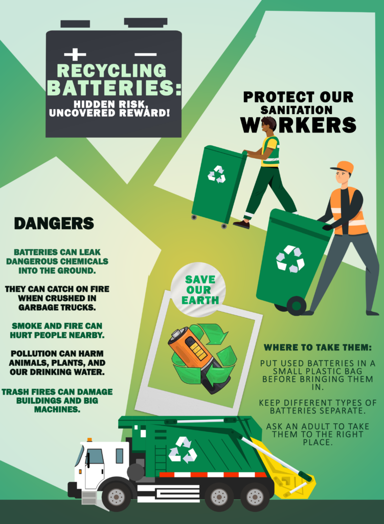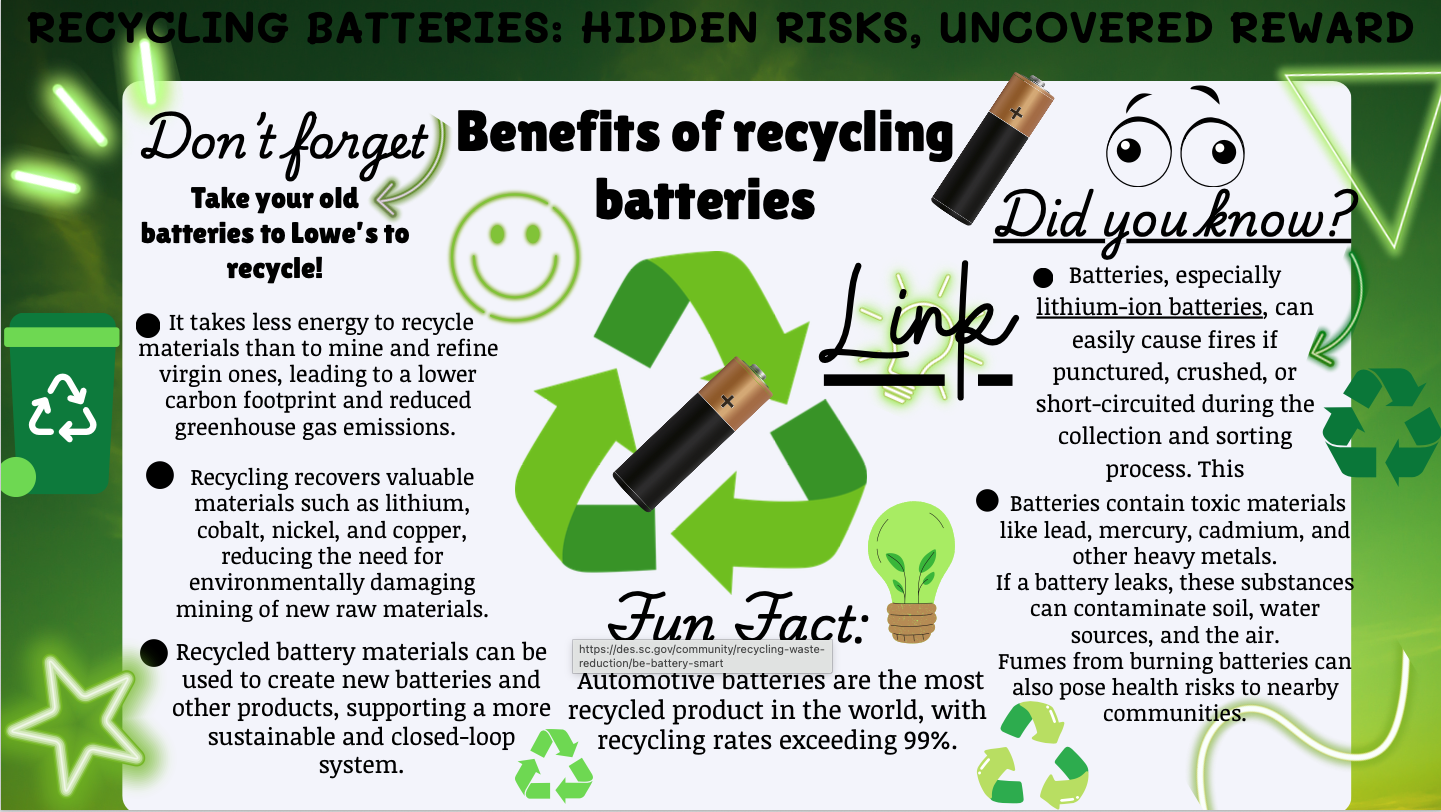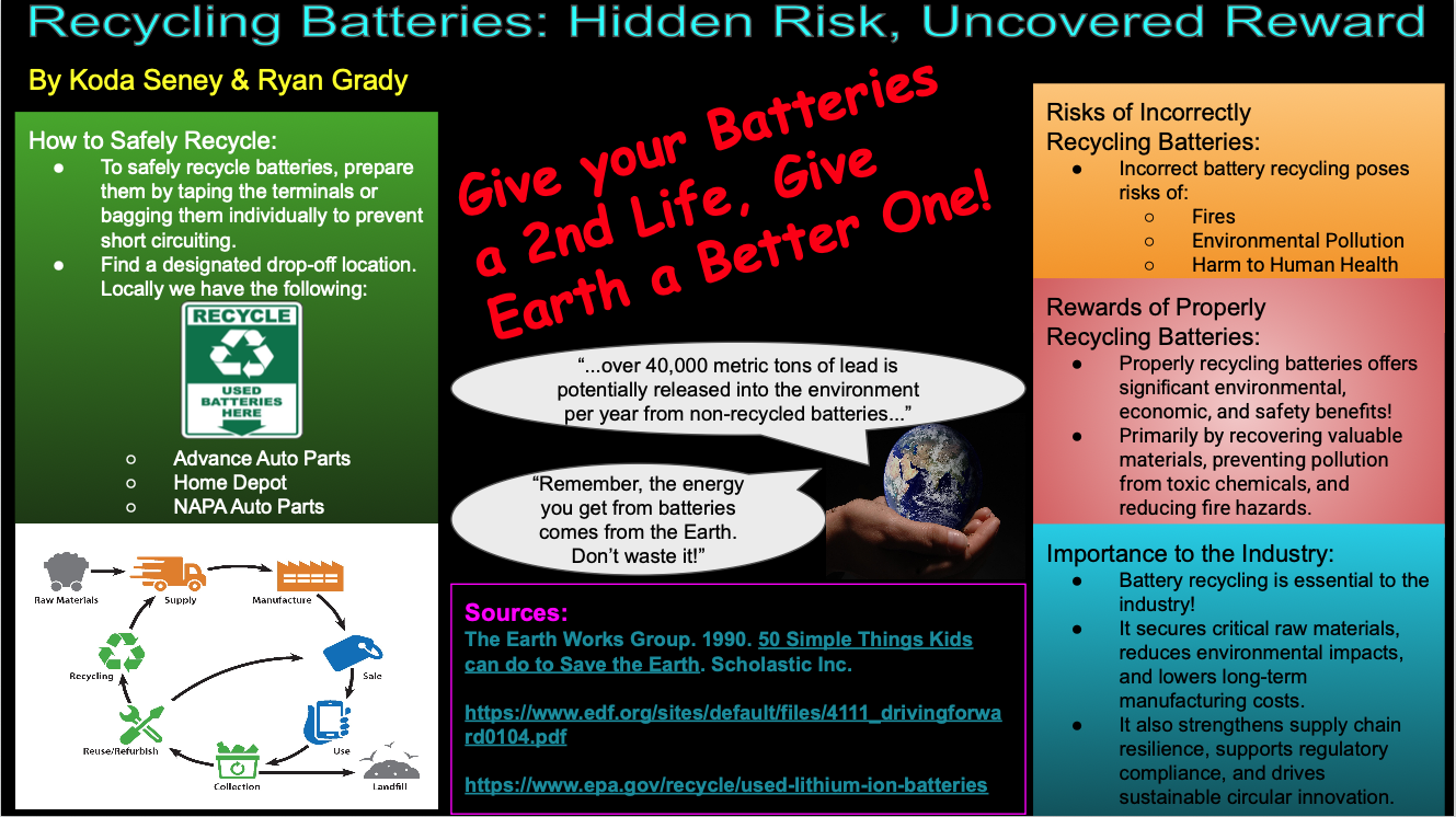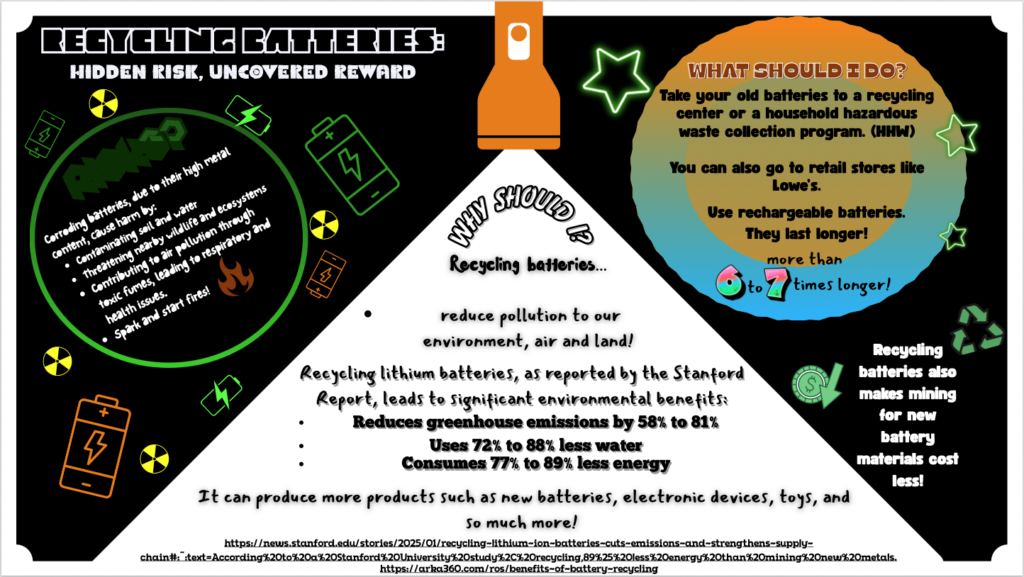 Eleventh grader Vayda LeMere, from Clover High School in Clover, SC, created this year’s winning poster submission. Her project represented the uncovered rewards and hidden risks associated with safe and unsafe battery recycling practices.