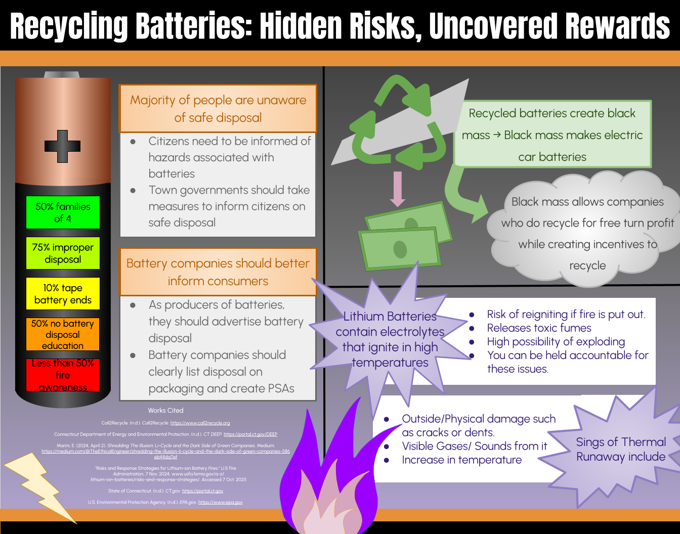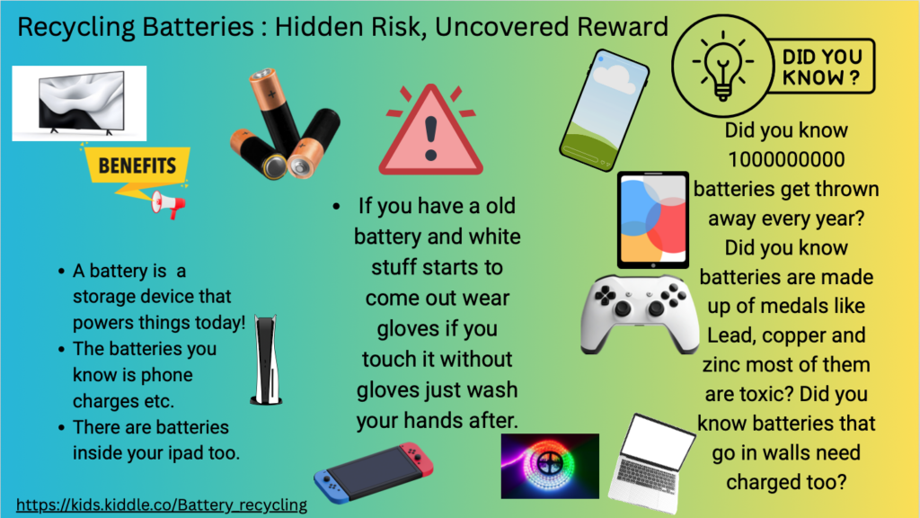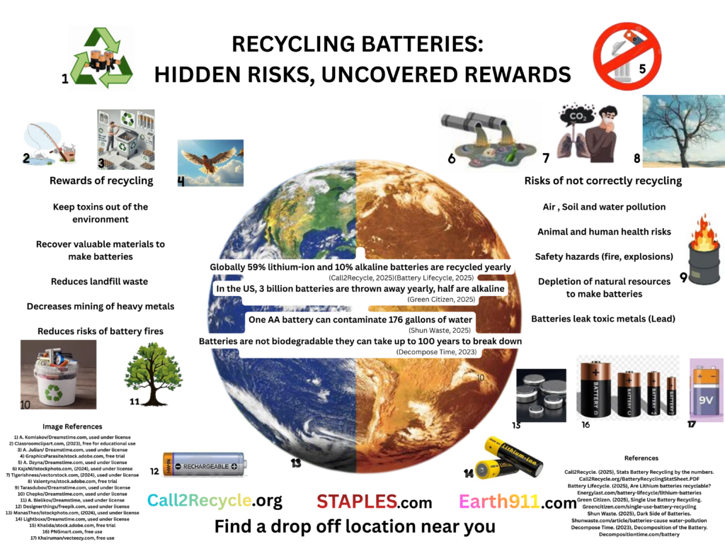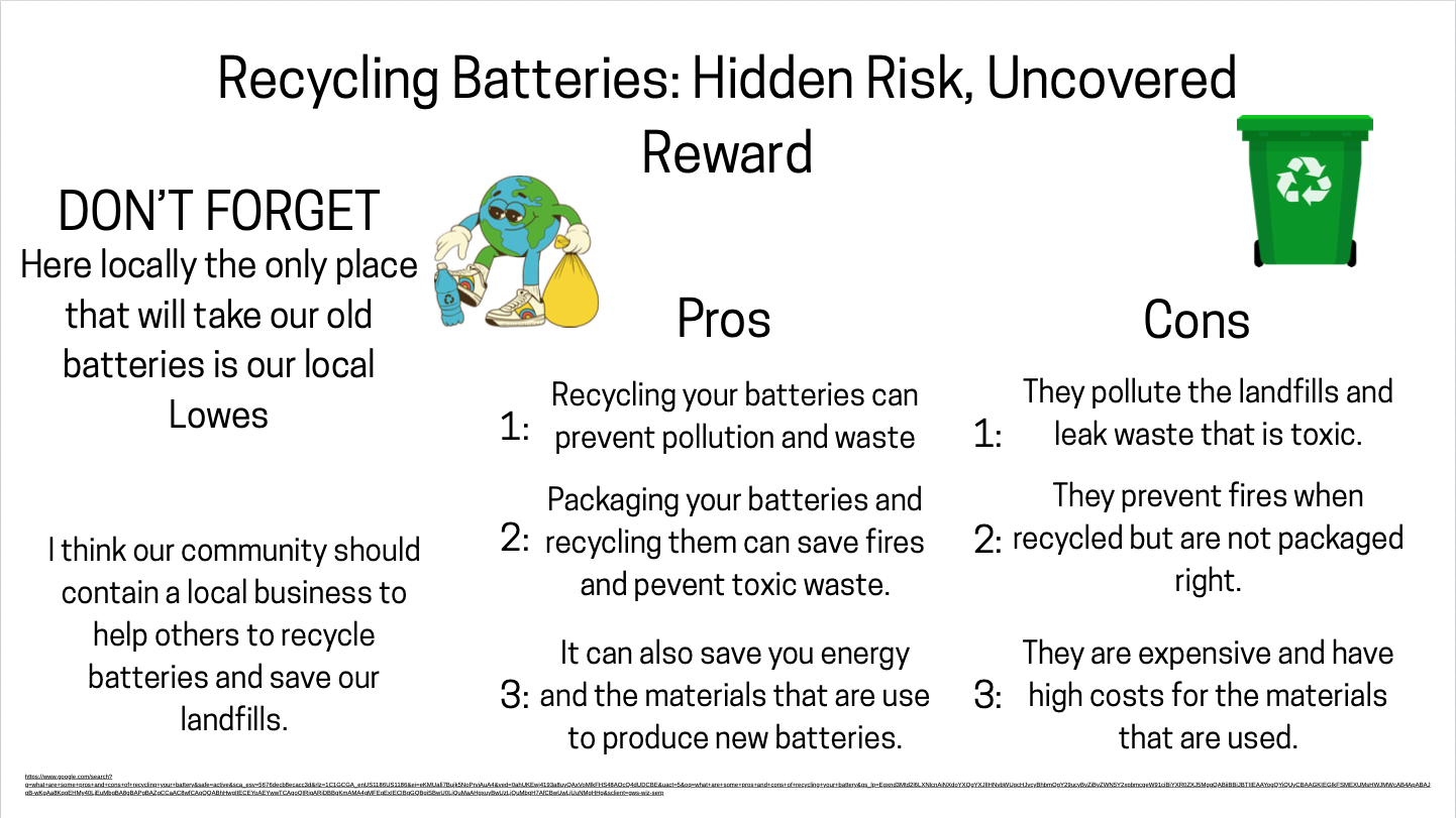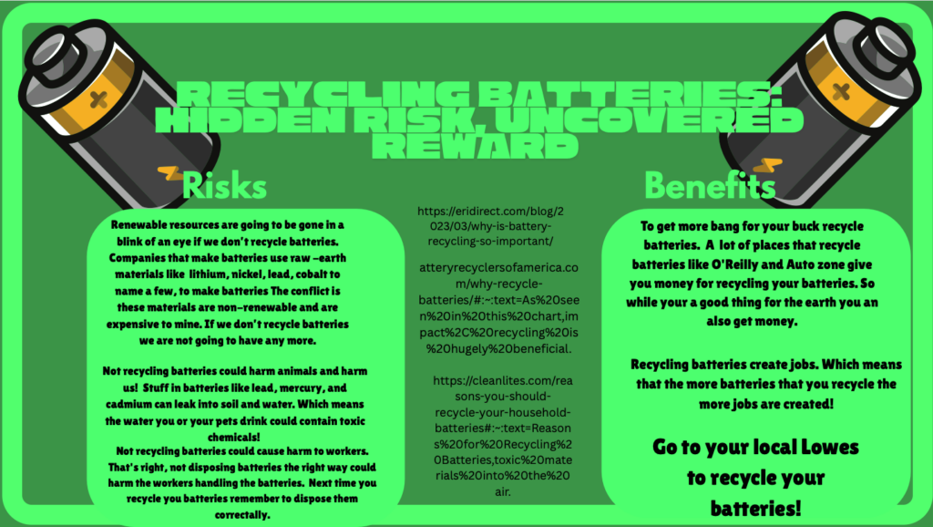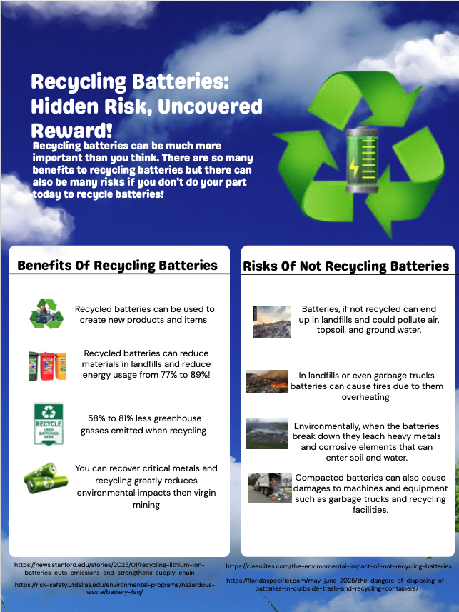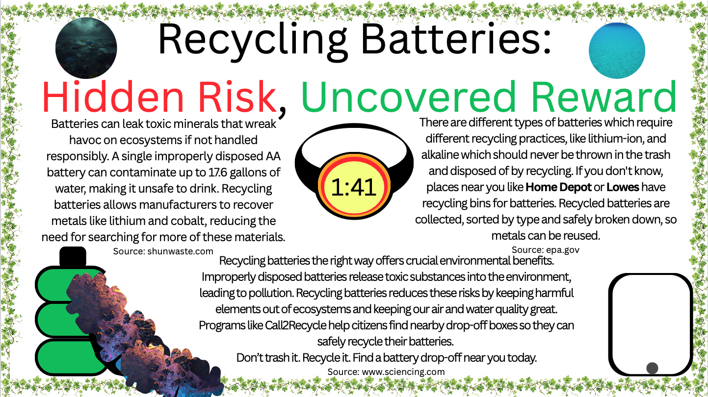 Eleventh grader Vayda LeMere, from Clover High School in Clover, SC, created this year’s winning poster submission. Her project represented the uncovered rewards and hidden risks associated with safe and unsafe battery recycling practices.