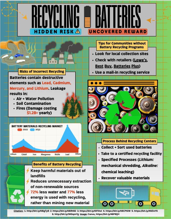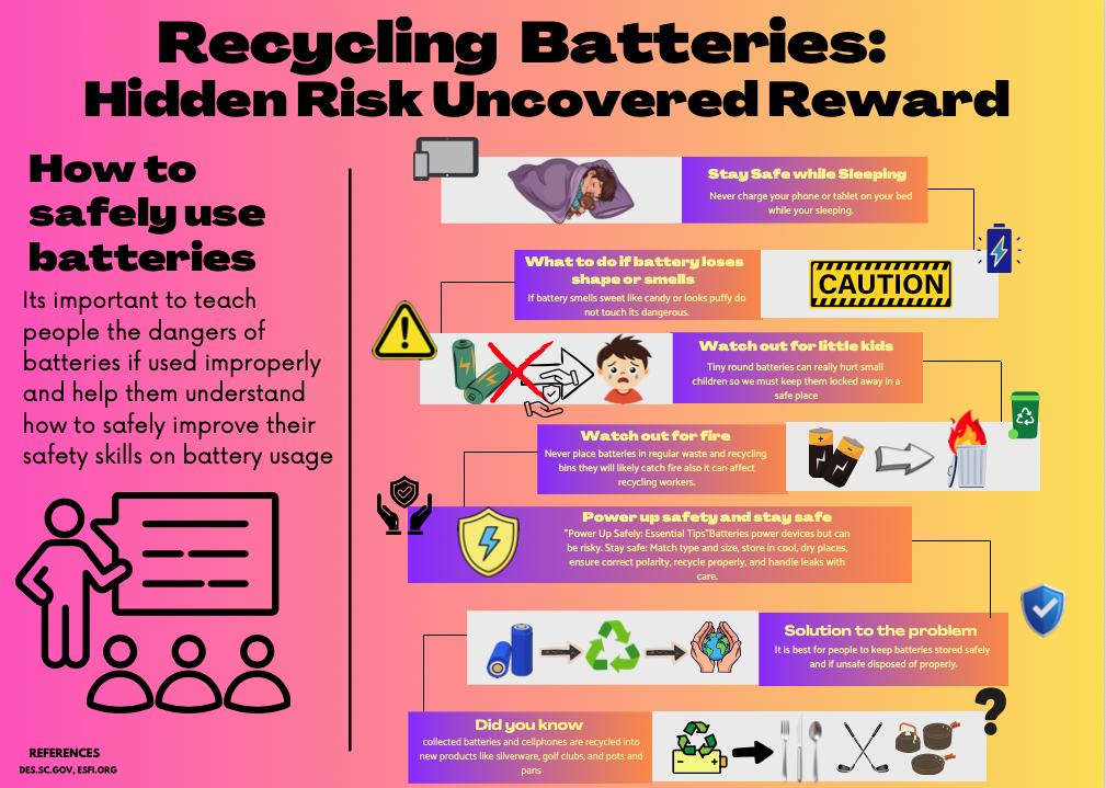 Twelfth grader Cheyenne Joshi, from Clover High School in Clover, SC, created this year’s winning poster submission. Her project represented the uncovered rewards and hidden risks associated with safe and unsafe battery recycling practices.